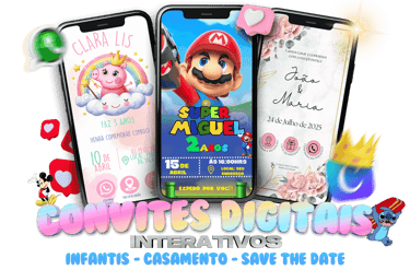 Agora você ganha de BRINDE um pacotão com mais de 100 artes de CONVITES DIGITAIS INTERATIVOS! São modelos incríveis, todos 100% editáveis para diversas ocasiões. O pacote inclui temas variados, como INFANTIS, CASAMENTOS, SAVE THE DATE e muitos outros, garantindo opções perfeitas para atender a diferentes estilos e necessidades. Aproveite essa oportunidade para surpreender e encantar com convites únicos e cheios de personalidade! E com um extra a mais, uma coleção de MOCKUPS PARA DIVULGAÇÃO dos convites.